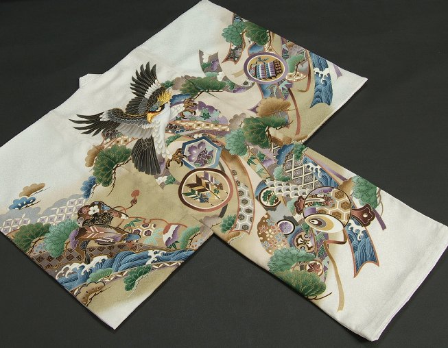 お宮参り 着物 男の子 正絹初着 男の子用産着 白 金糸刺繍鷹 松竹梅 小槌 まだら地紋