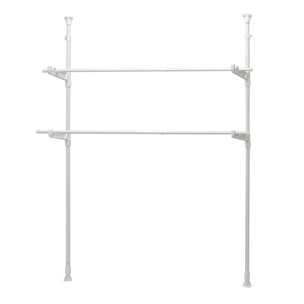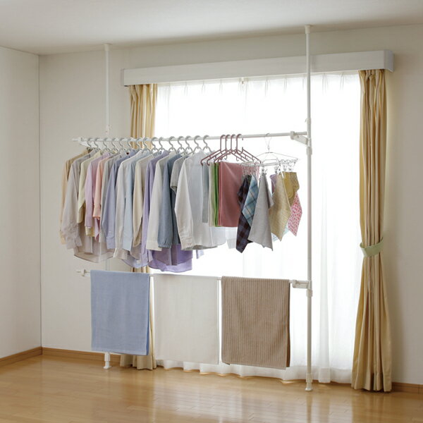 ●商品サイズ(約):幅110〜190×奥行37×高さ190〜260cm ●重量:3.9kg ●耐荷重 全体:20kg 竿1本あたり:12kg ●干す量の目安:シャツ等15枚、バスタオル3枚、タオル4枚、小物20枚 ●材質 パイプ:塩化ビニール被覆鋼管 樹脂部分:ポリプロピレン、ABS樹脂、合成ゴム