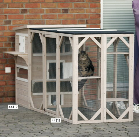 取り外し可能なバックパネルにより、猫ちゃんは窓や扉からキャッテリーにアクセスできます 屋根部分はアスファルト屋根仕様で耐候性仕上げの耐久性のあるデザインになっています。